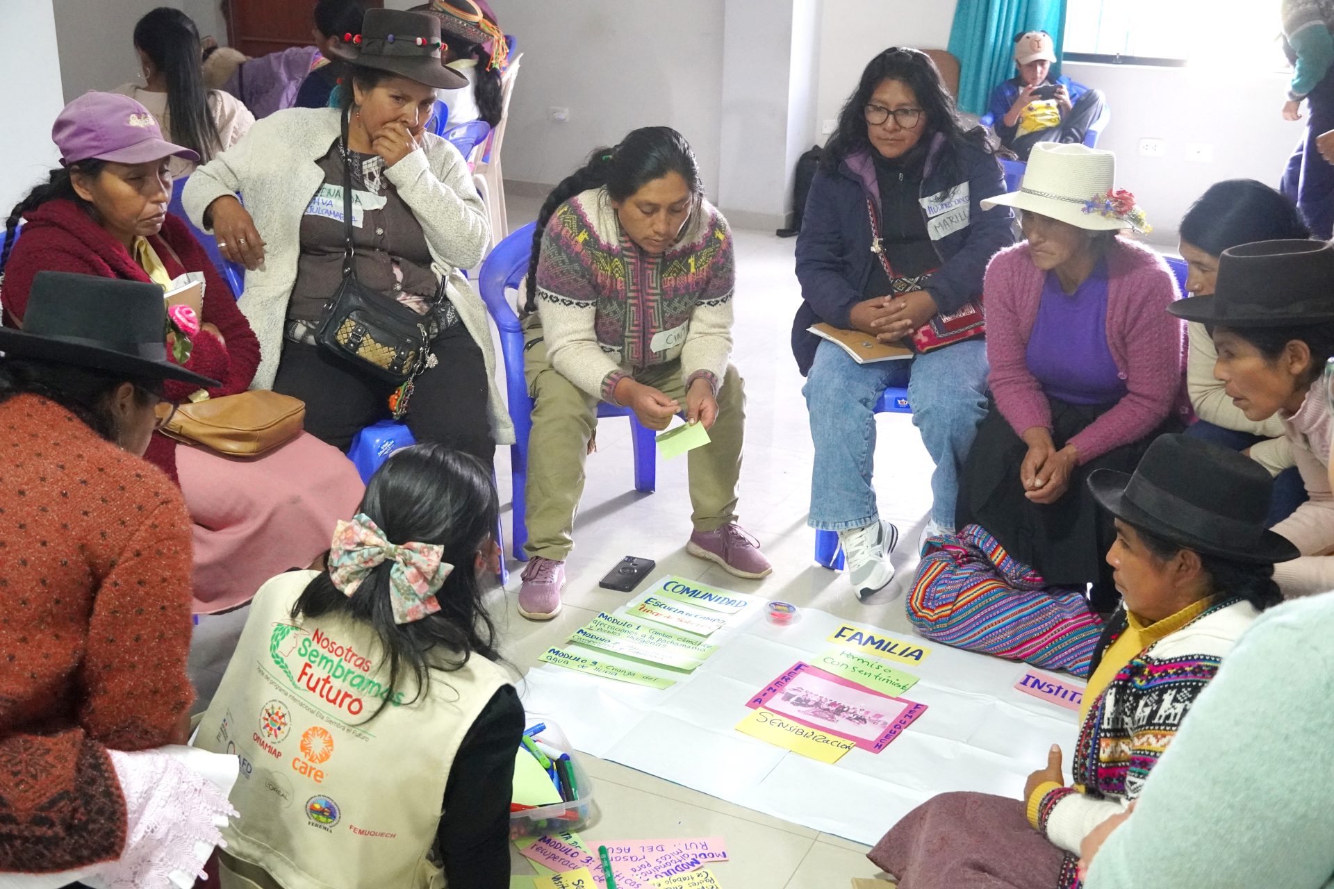 Posteriormente, con la participación de 30 lideresas se realizó un segundo encuentro enfocado en el fortalecimiento de capacidades técnicas y de cuidado colectivo. En este espacio, se priorizó un enfoque de autocuidado, reconociendo que las mujeres que defienden los territorios y protegen los ecosistemas también sufren violencias institucionales, así como fortalecimiento técnico vinculado a acciones de adaptación frente al cambio climático como la siembra y cosecha de agua para la recarga hídrica y la protección de las fuentes de agua (manantiales y bofedales), y la revaloración de los conocimientos y saberes ancestrales. Así mismo, se realizaron actividades para fortalecer su liderazgo colectivo para su incidencia en espacios que promuevan una agenda climática desde sus comunidades.